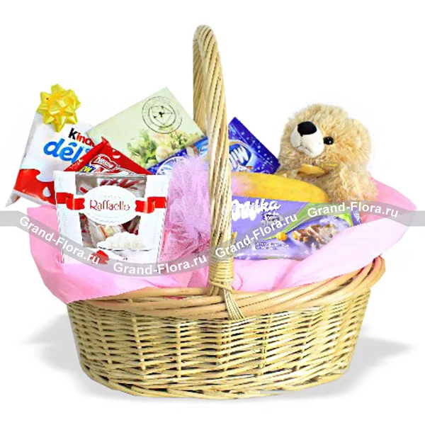 Наши феи-флористы собирают продукты для этой корзины в лучших супермаркетах! Здесь есть все, что нужно для прекрасного настроения и сказочной радости.
