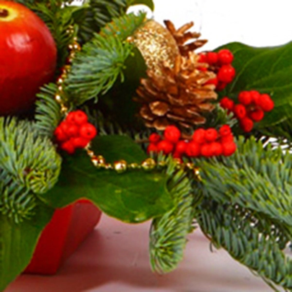 Новогодняя флористическая композиция с использованием декора в виде красных яблоков. Такая композиция согреет теплом в новогоднюю ночь