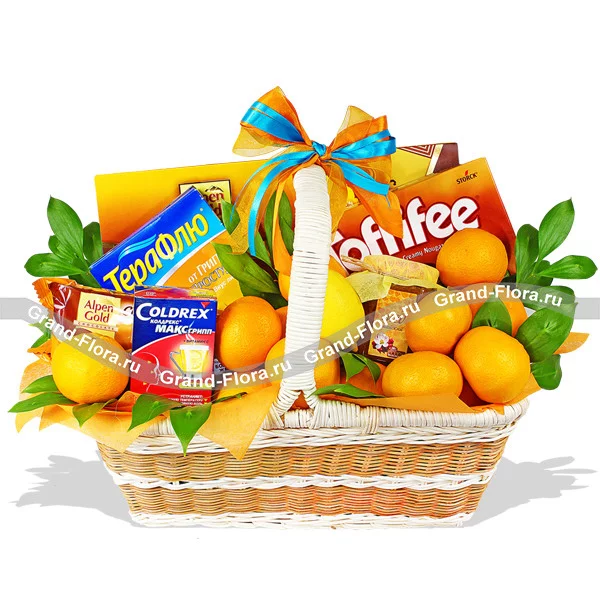 Люкс: мандарины - 0,5 кг, лимон - 1 шт, Toffifee - 1 уп., печенье "Alpen Gold" - 1 уп, коробка конфет "Alpen Gold" - 1 шт, Мед (500 г.) - 1шт, Coldrex МАКС Грипп - 1уп., ТераФлю - 1 уп, корзина средняя, декор.
