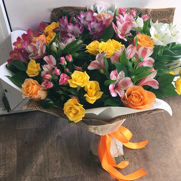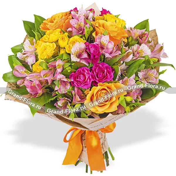 Стандартный: оранжевая роза - 3 шт, кустовая розовая роза - 2 шт, альстромерия розовая - 5 шт,