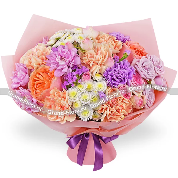 Люкс: роза персиковая - 3 шт.,гвоздика персиковая - 6 шт., гвоздика фиолетовая - 3 шт., роза кустовая розовая - 3 шт., роза кустовая фиолетовая - 2 шт., хризантема кустовая ромашковая фиолетовая - 3 шт., хризантема сантини - 3 шт., статица, упаковка, лента. Примерный размер: 40Х40 см.