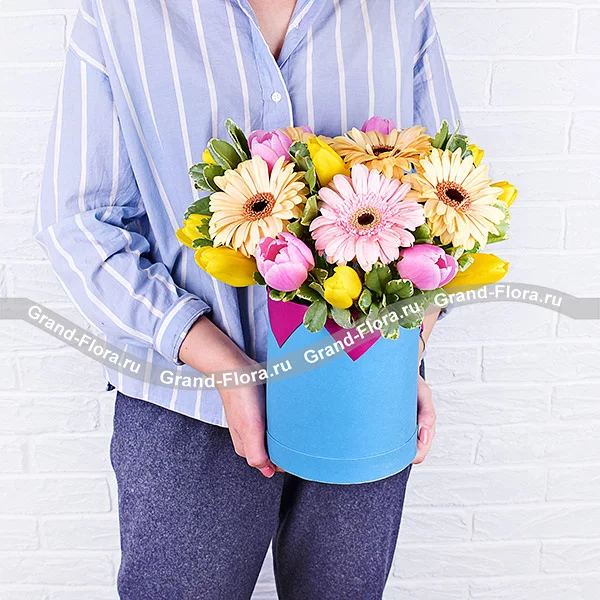 Ветер перемен - коробка с тюльпанами и герберами
