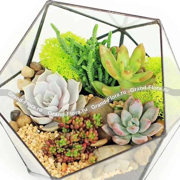 "Икосаэдр мини" - это небольшой флорариум с яркими суккулентами в вазе ручной работы. Очень гармоничная композиция, которая потребует минимального ухода. А весной, в период цветения суккулентов, от него просто невозможно оторвать взгляд!