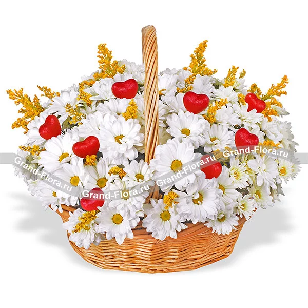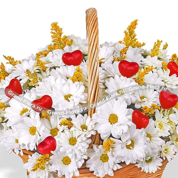 Композиция из очаровательных белых ромашек, дополненная солидаго и выразительными декоративными красными сердечками наверняка запомнится получательнице своей наивной простотой. Яркая и нежная композиция проложит путь к сердцу интересующей Вас девушки. Букет в корзине поможет выразить любовь к маме в день ее рождения и к девушке в годовщину отношений.